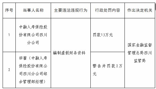 【大河财立方消息】4月17日,国家金融监督管理总局四川监管局披露的行政处罚信息公开表显示,中融人寿保险股份有限公司四川分公司因编制虚假财务资料被罚款13万元。中融人寿四川分公司综合管理部经理田蕾被给予警告并罚款2万元。